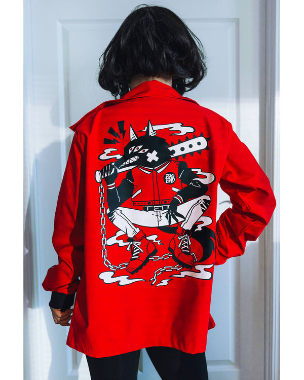 I don't own this or anything from kinwamonster, but I'm seriously considering it with this one, because this jacket is so unbelievably powerful, in color, illustration, and form. The figure (presumably called BIG BAD) is wonderfully rigid, assertive, and evocative, but the style is flat enough that I don't think I'd shy away from wearing it out of fear of making any kind of grotesque statement. This one remains firmly on my wishlist and is eyeing my wallet!